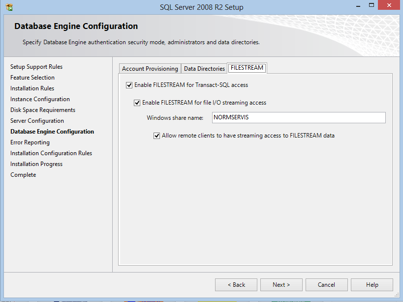 12. Nyní je ještě potřeba nastavit tzv. „FILE STREAM“. Klikněte na horní záložku „FILESTREAM“ a označte všechny body tak, jak je to zobrazeno na obrázku: