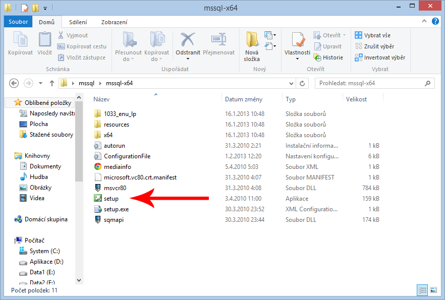 4. Po ukončení extrahování se Vám ve složce zobrazí složka nová „mssql-x64″ (pokud stahujete instalaci pro 32 bitový operační systém, tak „mssql-x86″). Složku otevřete a spusťte soubor „setup.exe“