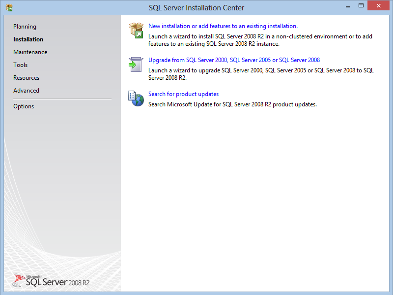 5. Pokud se Vám spustí SQL Server Installation Center (nově ve verzi 2008), zvolte „Installation“ a následně odkaz „New SQL Server stand-alone installation or add features to an existing installation“.