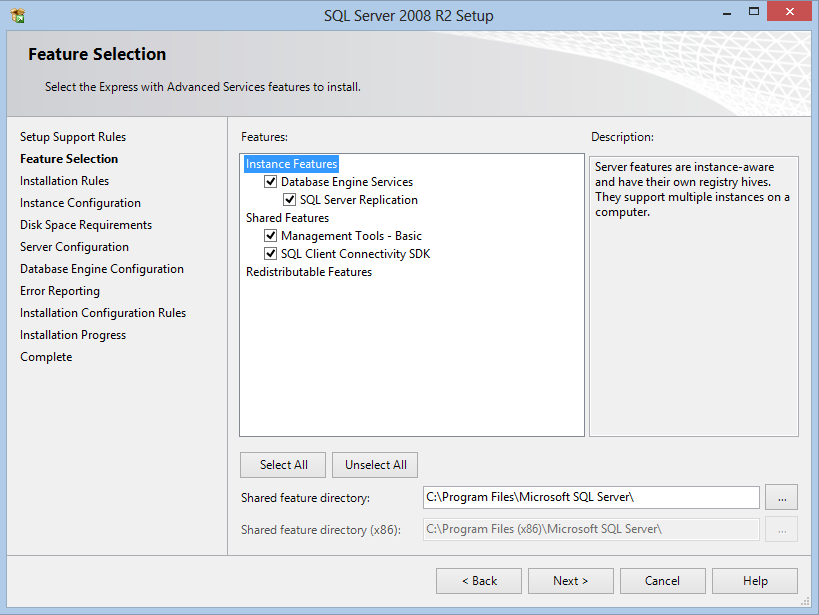 7. Jste-li na položce „Feature Selection“, Váš operační systém splňuje minimální požadavky a instalace může proběhnout. Pokračujte tlačítkem „Next“. (Budete-li chtít nainstalovat SQL na jiné místo než do Program files, vyberte si cestu v položce „Shared feature directory“)