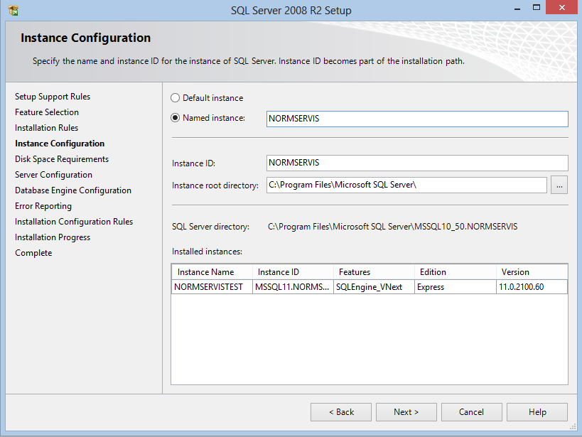8. Nyní se dostáváme do samotné instalace MSSQL serveru. Na obrázku můžete vidět, že je potřeba nastavit jméno nové instance, zvolte tedy název instance „NORMSERVIS“. ID instance by se Vám mělo automaticky předvolit stejné jako název instance. Po nastavení jména pokračujte dál.