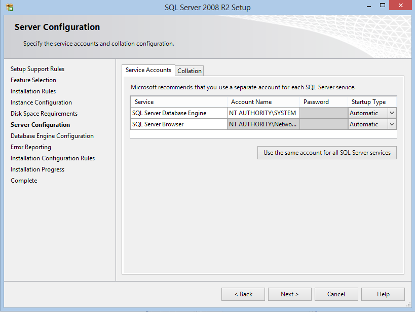 9. Nyní musíte u položky SQL Server Database Engine nastavit položku Account Name na „NT AUTHORITYSYSTEM“. Ostatní položky neměňte.