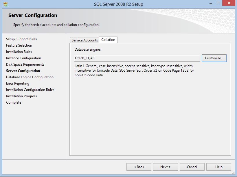 10. Ještě před pokračováním na další krok je potřeba zkontrolovat „Collation“. V tomto kroku je ve vrchní části záložka s tímto jménem. Klikněte na ni a zkontrolujte, jestli je „Collation“ nastavené na Czech_CI_AS. Pokud ne, nastavte jej.